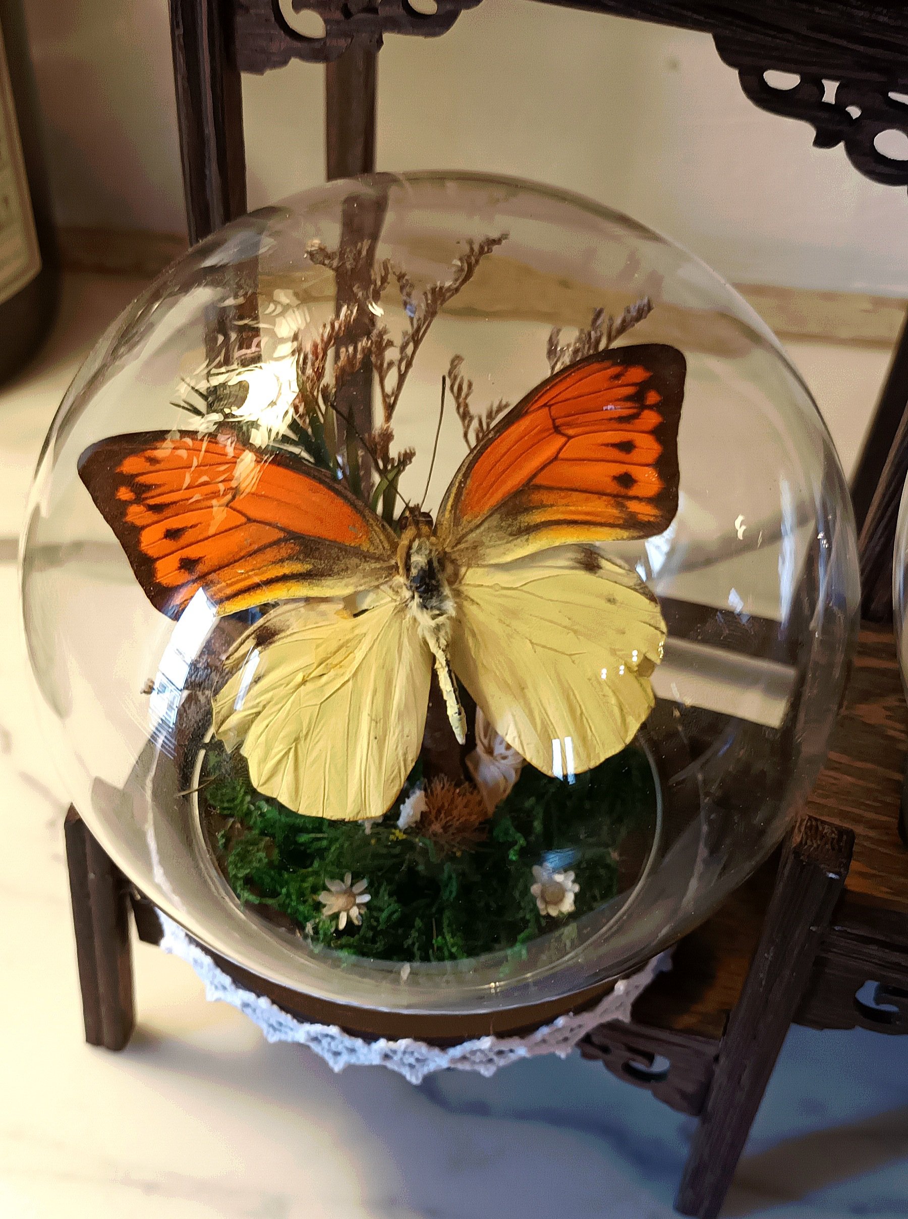 Composition comprenant un papillon de la famille des pièrides, sous boule en verre, socle en bois marron et dentelle.