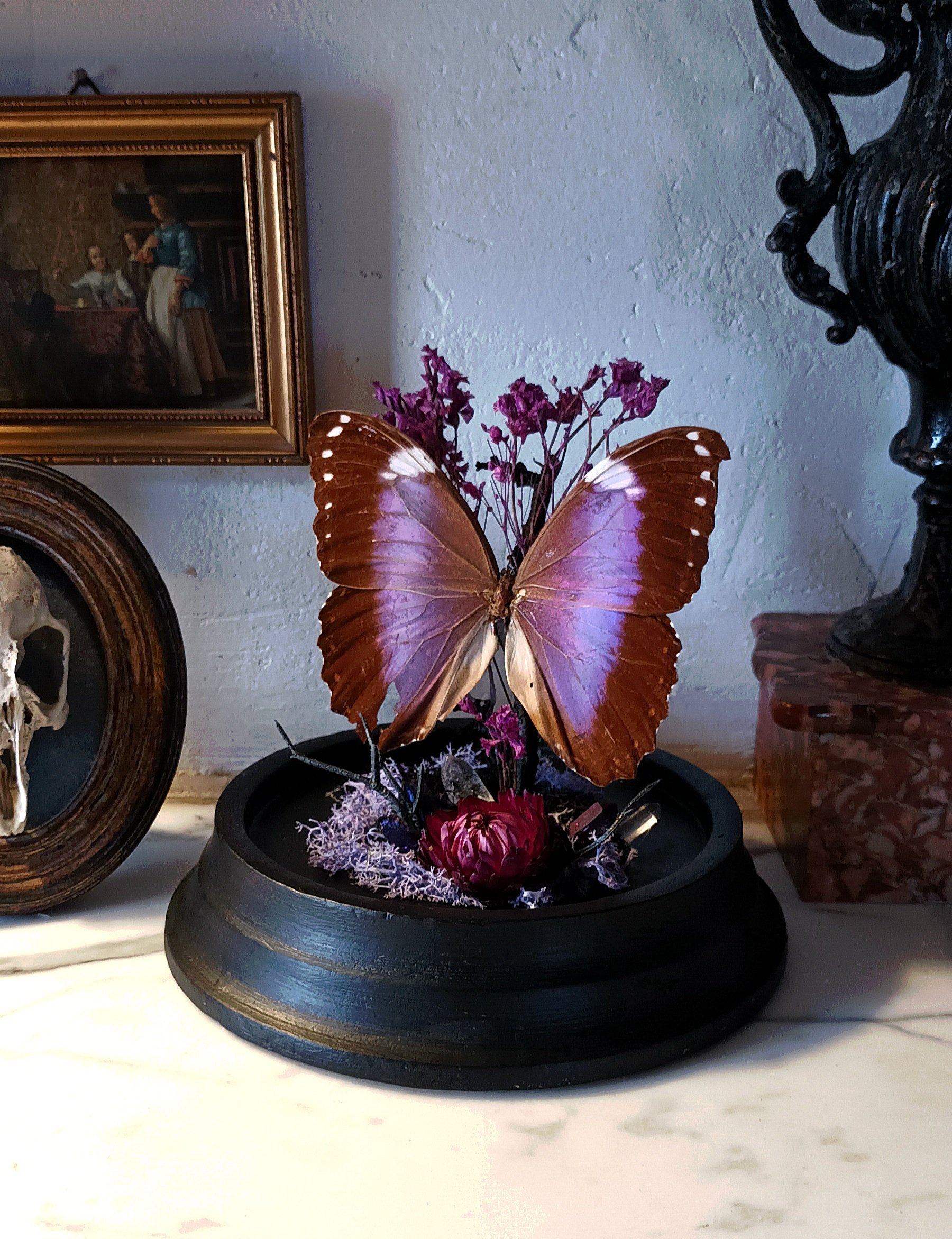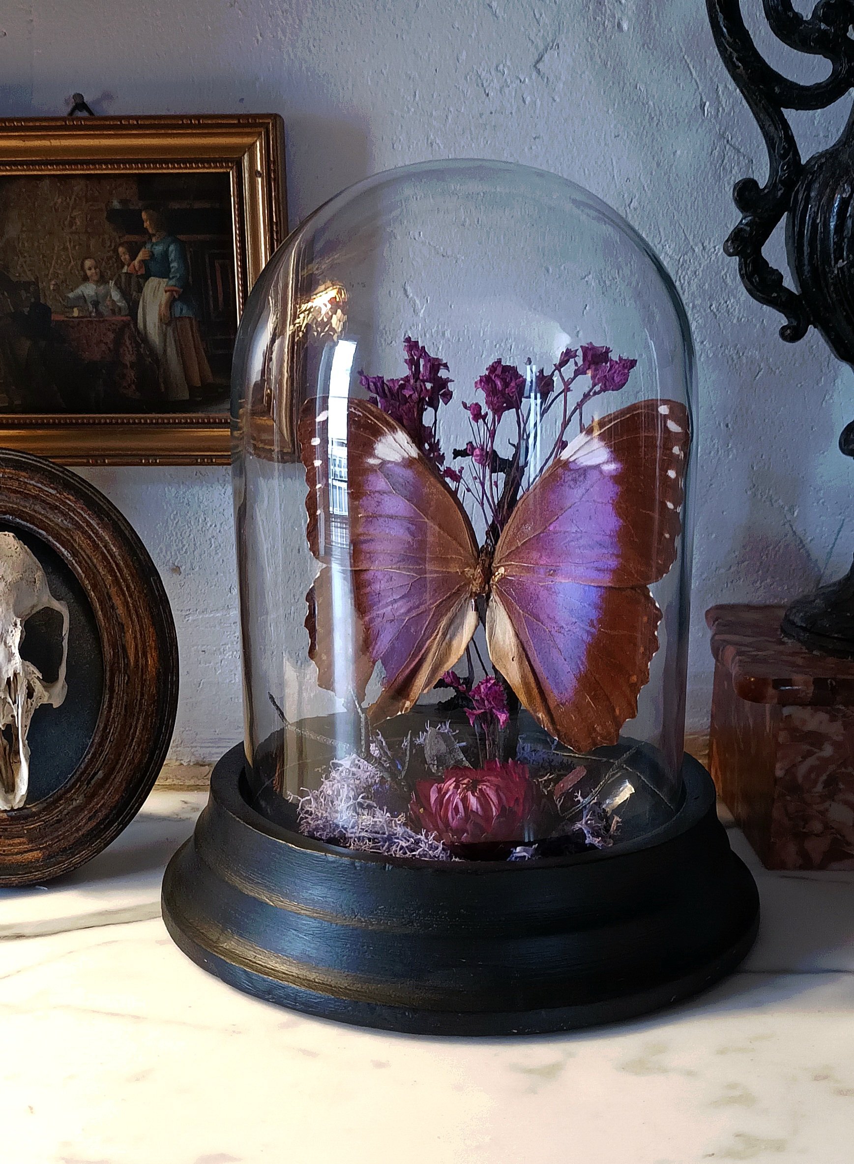 Création entomologique sous cloche en verre, support en bois peint noir vintage.