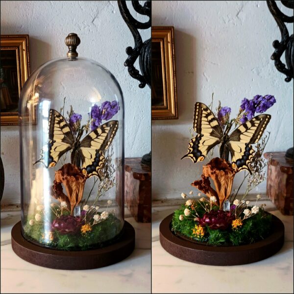 Création entomologique sous cloche en plexi, contenant un machaon, papillon français. Mousse, fleurs séchées et branche naturelle.